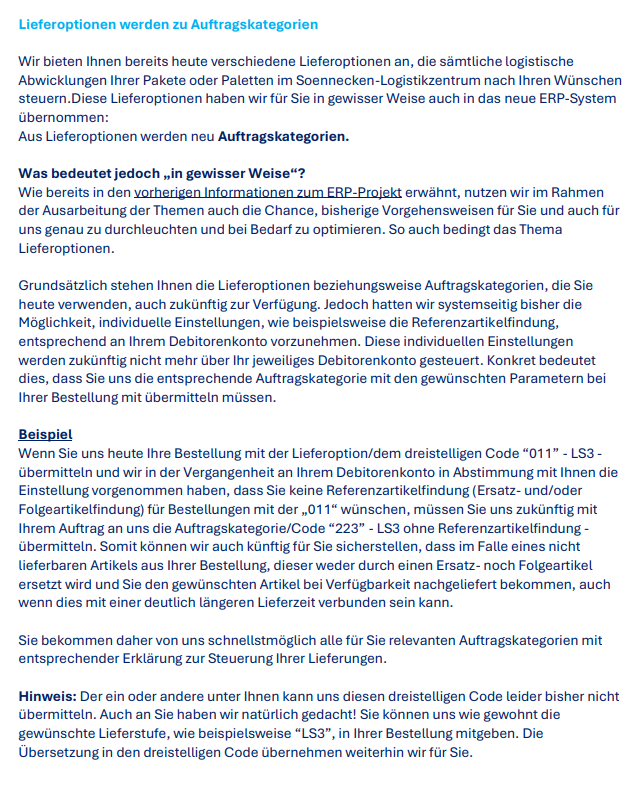 Weitere wichtige Informationen im Zusammenanhang mit dem ERP-Wechsel SoFlex seitens Soennecken.