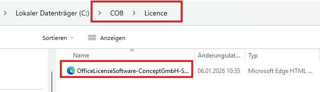 Es öffnet sich das zentrale CO-Verzeichnis über den Windows-Explorer. Bitte legen Sie vorab die Lizenz (eventuell ZIP-Datei vorher entpacken) dort ab und starten Sie diese per Doppelklick: