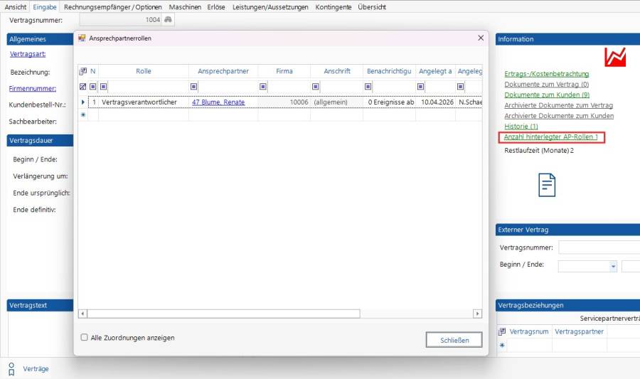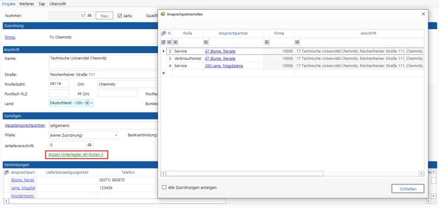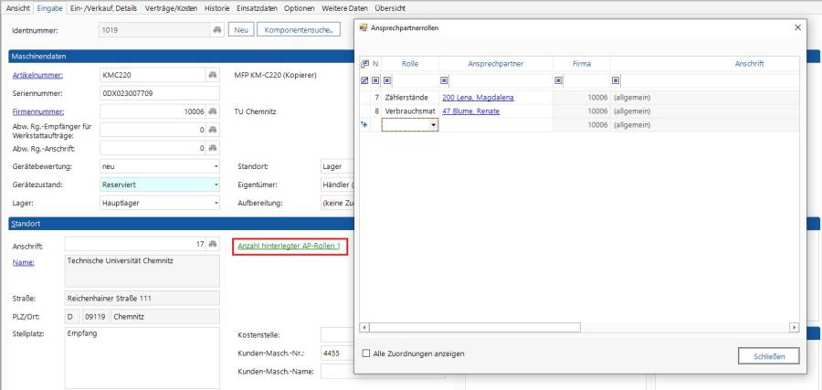 - können jetzt zu einer Rolle mehrere Ansprechpartner angezeigt werden. Wenn es keine konkreten Ansprechpartner zur Anschrift gibt, werden alle allgemeinen Ansprechpartner dieser Rolle/Firma angezeigt. Es werden nur die Rollen für Service und Verbrauchsmaterial angezeigt.