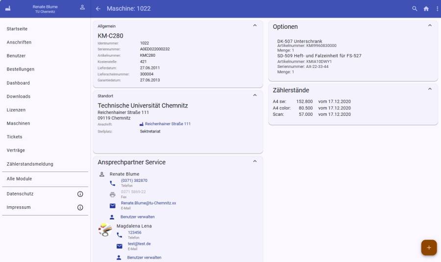 - werden jetzt zu einer Rolle auch mehrere Ansprechpartner angezeigt. Wenn es keine konkreten Ansprechpartner zur Maschine gibt, werden alle allgemeinen Ansprechpartner dieser Rolle/Standort angezeigt. Ist auch am Standort nichts hinterlegt, werden die allgemeinen Ansprechpartner der Firma angezeigt. Es werden nur die Rollen für Service und Verbrauchsmaterial angezeigt.