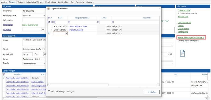 - Ansprechpartnerrollen pro Kunde, Anschrift, Maschine mit entsprechender Vererbung
