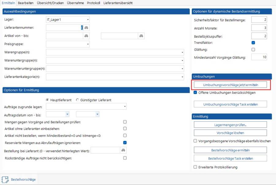 Über das Modul „Bestellvorschläge (BV)“ können sowohl Bestellvorschläge, als auch Umbuchungsvorschläge erstellt werden.