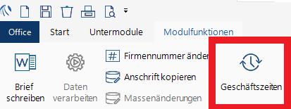 Zum Eintragen oder Ändern der Geschäftszeiten öffnen Sie das Modul Firmen unter Stammdaten. Im Menü unter „Modulfunktionen“ kann die Bearbeitungsansicht der Geschäftszeiten geöffnet werden.
