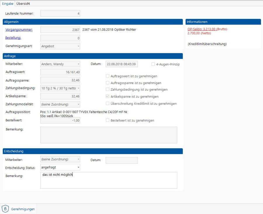 Im Modul Genehmigungen entsteht eine Anfrage. Diese muss durch einen autorisierten Mitarbeiter erteilt werden. Dieser Mitarbeiter muss über zwei Voraussetzungen verfügen: