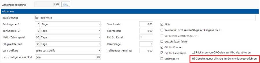 Ob für die Änderung der Zahlungsbedingungen im Vergleich zur Standardeinstellung am Kunden eine Genehmigung notwendig ist, kann hier eingestellt werden.
