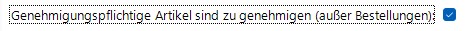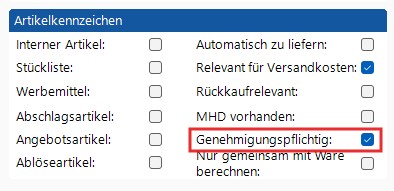 Innerhalb des Genehmigungsverfahrens gibt es die Möglichkeit, einzelne Artikel für ein Angebot als genehmigungspflichtig zu kennzeichnen. Dazu wurde am Artikel (Modul: Artikel / Gruppierungen & Weiteres) das Kennzeichen ‚Genehmigungspflichtig‘ eingeführt. Das Kennzeichen ist nur sichtbar bei vorhandener Lizenz ‚Genehmigungsverfahren‘.