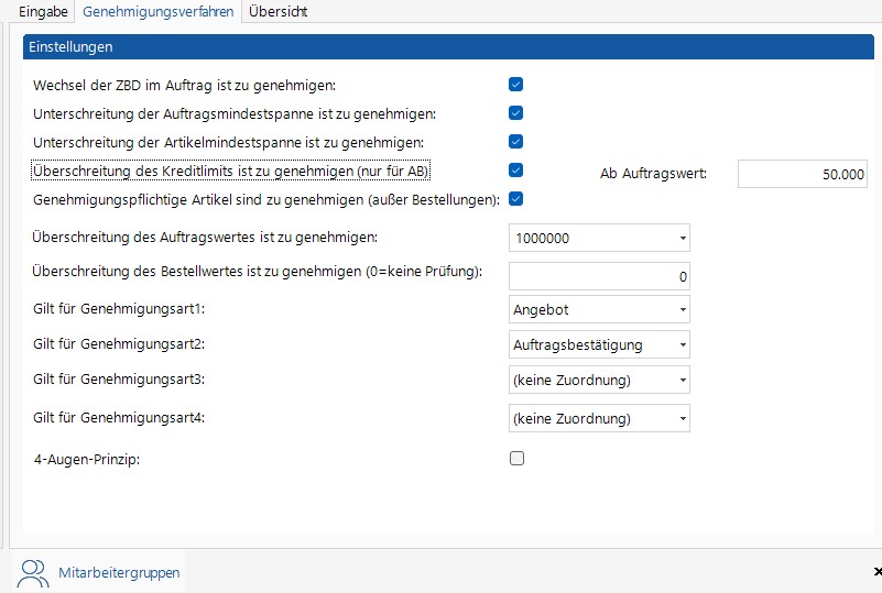 An einer Genehmigungsgruppe kann ausgewählt werden, ob das 4-Augen-Prinzip angewendet werden soll. Mindestens einer der genehmigenden Mitarbeiter muss über die benötigten Berechtigungen verfügen.