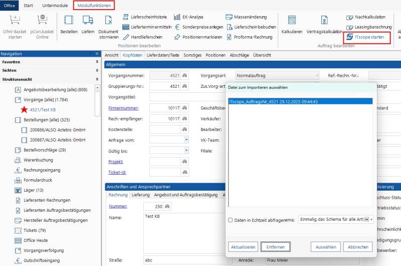 Im Vorgang kann über die Modulfunktion ‚ITscope starten‘ die Plattform aufgerufen werden. Ist neben ITscope auch COP als aktiv in den Externen System angelegt, dann erscheint ein derzeit noch ein Auswahlfenster. Neben dem Importdialog öffnet sich nun die ITscope-Plattform im Browser.