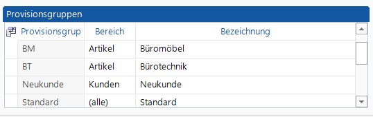 Diese Gruppe dient der Ermittlung von Provisionen, die für die Artikel gezahlt werden, an denen diese Gruppe im Artikelstamm hinterlegt wurde.