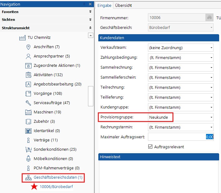 Auf der Kundenseite wird unter der Firma in den Geschäftsbereichsdaten die Provisionsgruppe hinterlegt.