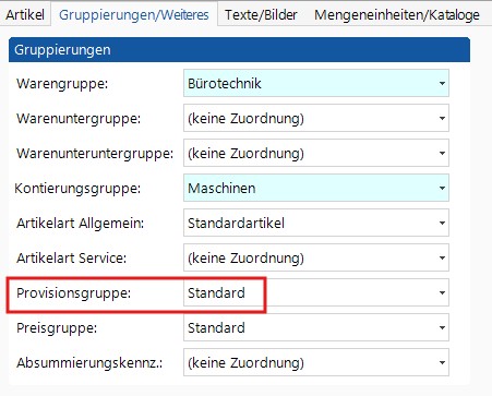 Am Artikel wird die Provisionsgruppe auf der Registerkarte Gruppierungen festgelegt.