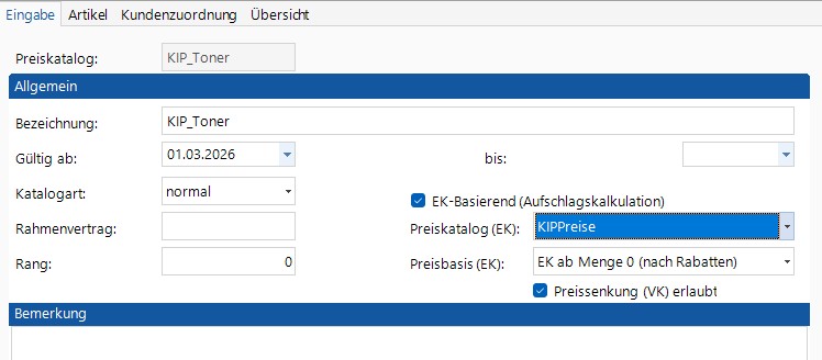 - Unter „Preiskatalog“ wird der Name des Preiskatalogs angegeben.