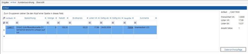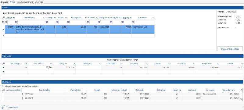 Rechts wird die VK-Preiseinheit, der Listen-VK und Listen-EK zum Artikel angezeigt. Unter der Artikelmaske können Staffelpreise zum Verkaufspreiskatalog erfasst werden.