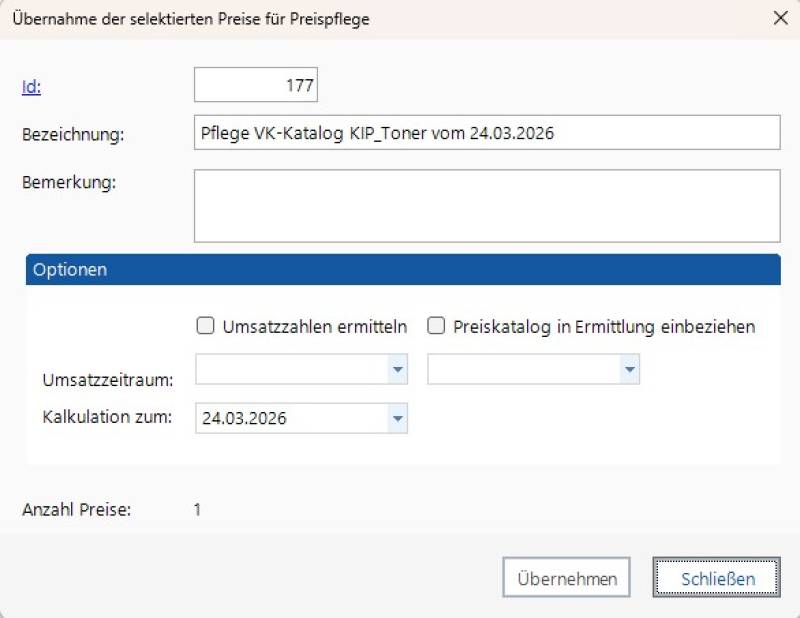 Anschließend erscheint eine Maske in der die Übernahme vollzogen werden kann. Die übertragenen Preiskataloge sind im Modul Preispflege wieder zu finden.