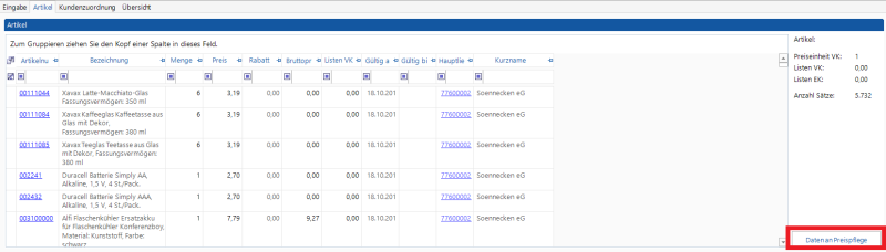 In dieser Reiterkarte ist möglich Artikel samt ihren Preisen an die Preispflege zu übergeben. Dazu muss der Button ‚Daten an Preispflege‘ getätigt werden.