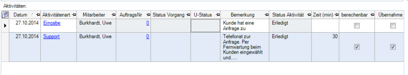 Für die aufgenommenen Aktivitäten kann entschieden werden, welche der Aktivitäten später in einen Service-Auftrag übernommen werden sollen. Beim Terminen wird die „Zeit“ in Minuten (Beginn Tätigkeit bis Ende Tätigkeit), zur Aktivität angezeigt. Für diese Aktivitäten kann eine Kennzeichnung erfolgen, ob eine Berechnung an den Kunden erfolgen soll.