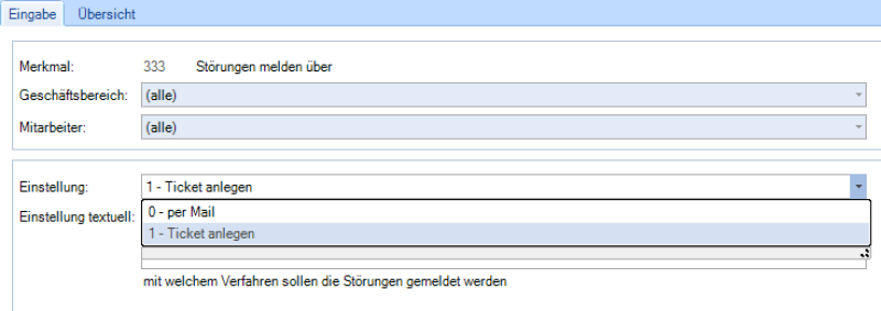 Es besteht die Möglichkeit programmseitig festzulegen, ob bei Anlage eines Tickets eine Benachrichtigungs-E-Mail an eine hinterlegte E-Mail-Adresse erfolgen soll. Diese Einstellung kann über die Konfiguration 402 definiert werden. Ebenso lässt sich unterscheiden, ob die Benachrichtigung für manuell angelegte oder importierte Tickets versendet werden soll. Sollen mehrere Empfänger benachrichtigt werden, müssen die Emailadressen getrennt mit ; in den Einstellungstext eingetragen werden.