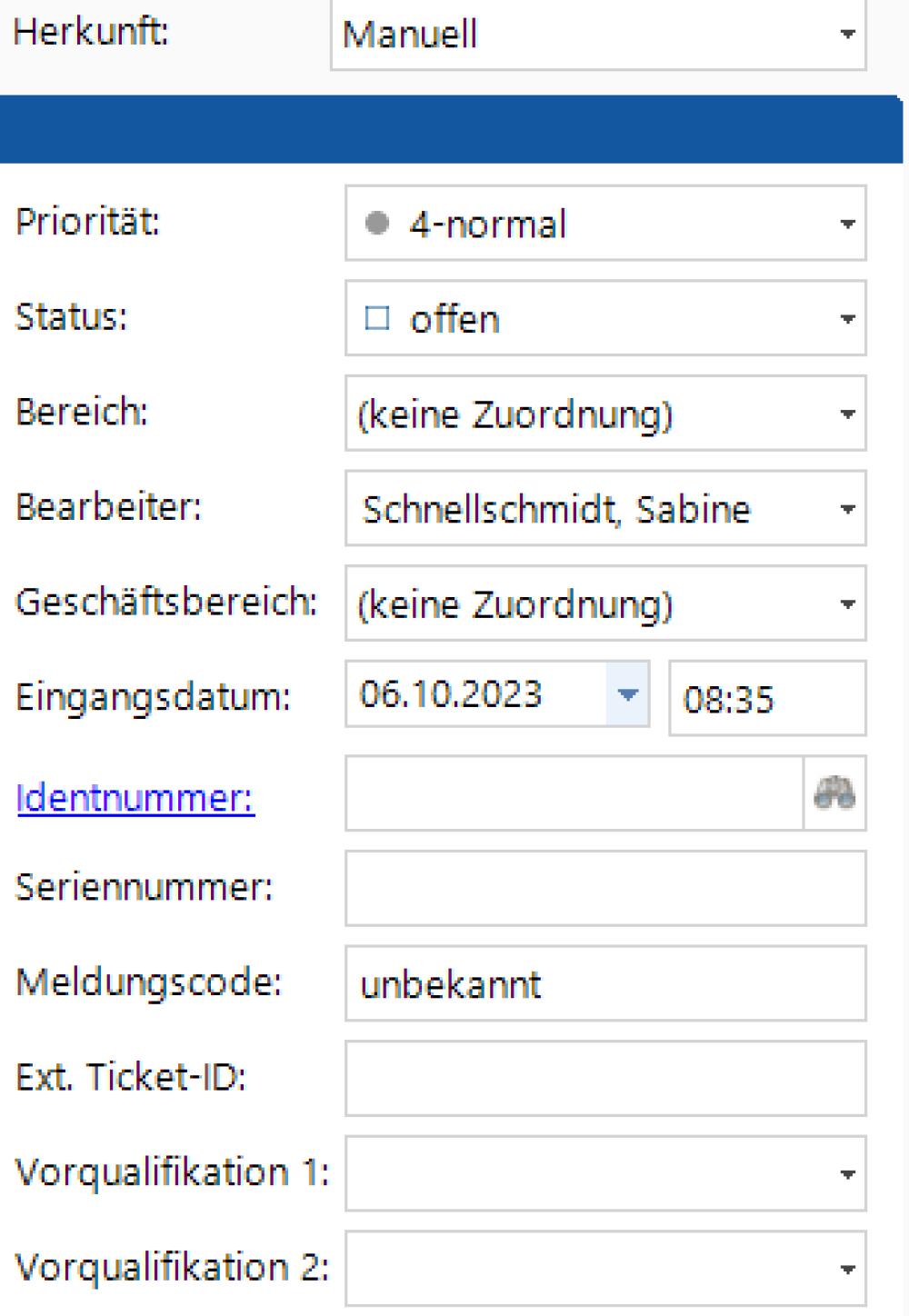 Beim Erfassen des Tickets wird eine fortlaufende Ticket-ID vergeben. Die Ticketart ist ein Pflichtfeld und wird ab der Version 7.0.5673 nicht mehr mit einem Standardwert (i.d.R. Störung) vorbesetzt, d.h. es muss bewusst die korrekte Ticketart gewählt werden. Um das erfasste Ticket weiter zu qualifizieren, wird dem Ticket die Herkunft des Tickets zugeordnet. Über den Betreff wird eine Kurzbeschreibung zum Ticket hinterlegt.