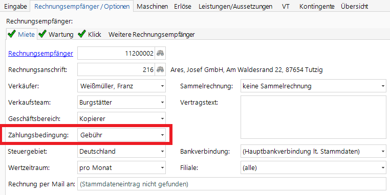 Öffnen oder legen Sie einen neuen Vertrag an. Im Reiter „Rechnungsempfänger/Optionen“ können Sie die Zahlungsbedingungen für Miete, Wartung und Klicks einstellen.