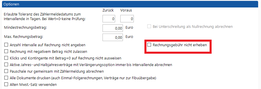 Bei der Vertragsabrechnung kann die Rechnungsgebühr deaktiviert werden.