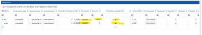 In 3 Spalten werden die drei Erlösarten Miete, Wartung und Klick angezeigt. Befindet sich darin kein Symbol, dann gibt es diesen Erlös in dem Vertrag für diese Maschine nicht. Ein grünes Häkchen aktiver Erlös zeigt an, dass ein aktiver Erlös vorhanden ist. Wird das Symbol einer Uhr angezeigt, dann ist der Erlös entweder noch nicht oder nicht mehr aktiv.