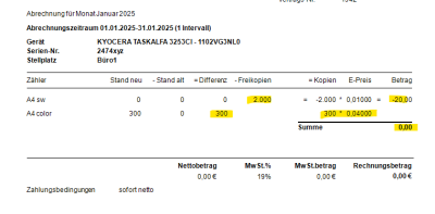Vertragskonstrukt: mit dem Kunden ist eine Wartungspauschale vereinbart, z. B. 20 Euro. Die Maschine hat einen SW- und einen Farbzähler. Ziel ist es, beide Zähler durch die Pauschale abzurechnen, ohne dass man zuvor eine Freikopienanzahl je Zähler festlegt. Vorgehen: