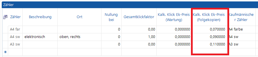 Haben sie verschiedene Modelle in der Vertragskalkulation mit verschiedenen Verkaufspreisen für Folgeklicks, dann wird bei der Vertragsanlage der Verkaufspreis der Folgeklicks für den Pool unter Berücksichtigung der hinterlegten Freikopien gemittelt.