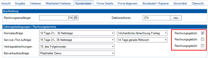 Öffnen Sie Firmen unter Stammdaten und wählen Sie die entsprechende Firma aus. Im Reiter Kundendaten können Sie im Abschnitt „Zahlungsbedingungen / Rechnungstermine“ festlegen für welche Art von Aufträgen die Rechnungsgebühr erhoben werden soll. Hierfür setzten Sie einfach die jeweiligen Häkchen. Rechnungsgebühren sind möglich bei: