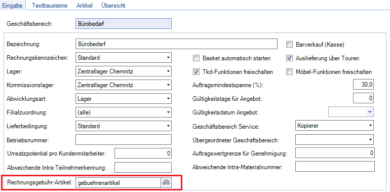 Öffnen Sie Geschäftsbereiche unter Weitere Stammdaten und wählen Sie den entsprechenden Geschäftsbereich aus. Im unteren Abschnitt des Eingabe-Reiters finden Sie „Rechnungsgebühr-Artikel“. Wählen Sie hier nun über die Artikelsuche den gewünschten Gebührenartikel aus, der für den Geschäftsbereich gültig sein soll.