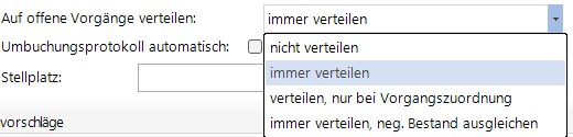Die Option „auf offene Vorgänge verteilen“ bewirkt ein Zubuchen von Artikeln auf lagerbezogene Vorgänge. Hier werden in Reihenfolge der Vorgangsanlage den einzelnen Vorgängen die Artikel zugeteilt, bis die bestellte Menge ausgeschöpft ist. Nicht zugeordnete Artikel werden auf das entsprechende Lager gebucht.