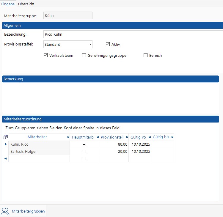 Wenn in der Mitarbeiterzuordnung unter Provisionsteilung ein Wert angegeben wird, muss die Summe aller Prozentwerte der verschiedenen Mitarbeiter 100% ergeben. Wenn in der Gruppe ein Mitarbeiter ohne Wert ist, bekommt dieser in einem Vorgang als Verkäufer KEINE Provision, sondern nur die Mitarbeiten, die einen Prozentwert hinterlegt haben.
